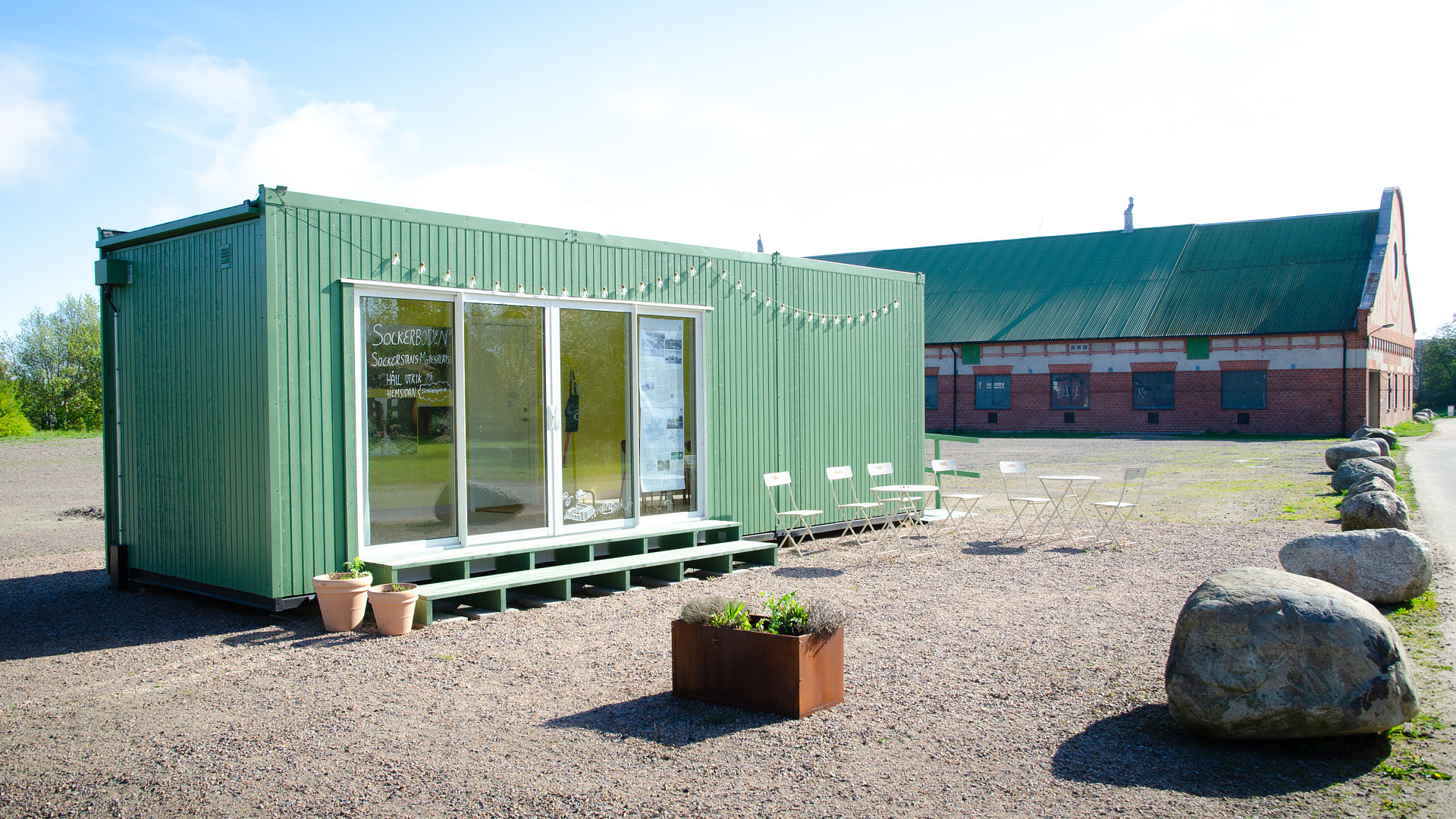 Sockerboden, en grön byggnad som fungerar som mötesplats, finns nu på plats i Sockerstan och kommer hållas öppen vid vissa tider för möjlighet till information och frågor.