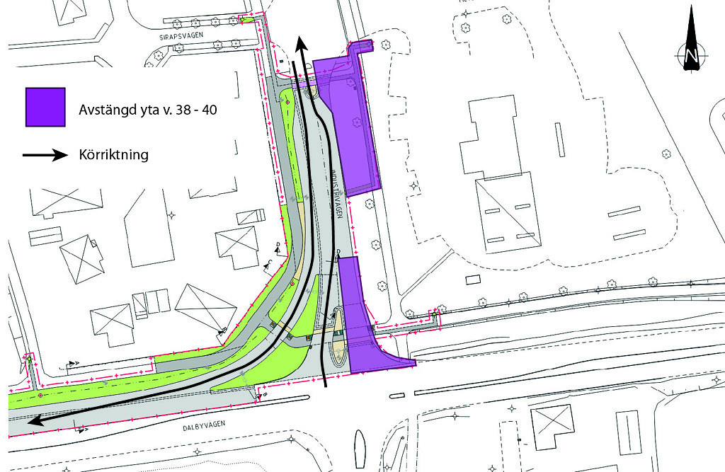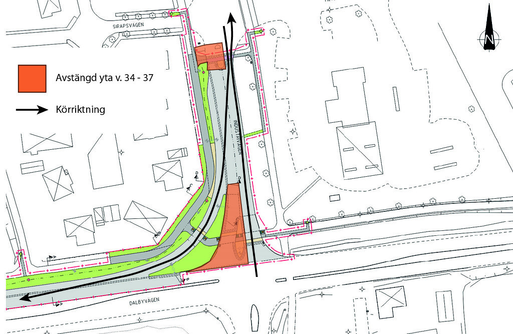 Under arbetet kommer framkomligheten på Industrivägen vara begränsad och skyltning kommer förändras beroende på vilka arbeten som utförs. Om möjligt så välj annan väg. Trafik från Dalbyvägen kommer kunna använda Industrivägen under hela arbetet. Trafik ut från Industrivägen mot Dalbyvägen, Väg 108 och Väg 11 kör det nya högersvängfältet och kan vända i cirkulationen vid Sockerstan eller i korsningen vid Knutsborg när möjlighet finns.
