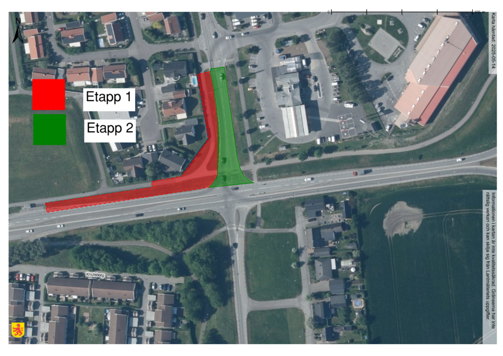Högersvängfältet är i sin utformning anpassad med utgångspunkt i det pågående arbetet med att bygga en cirkulation i korsningen.