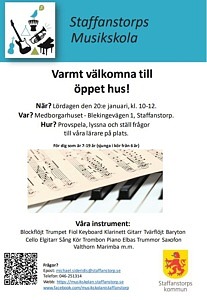Lördagen 20 januari kl. 10-12 håller Staffanstorps Musikskola öppet i Medborgarhuset för alla nyfikna barn och deras vuxna! Kom och träffa alla våra lärare och prova på ett eller många instrument! Vi erbjuder undervisning i bland annat sång, elbas, piano, fiol, cello, afrikansk marimba, trummor, gitarr, tvär/blockflöjt, trombon, trumpet och många andra instrument!