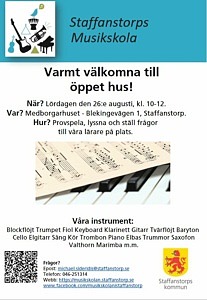 Lördagen 26 augusti kl. 10-12 håller Staffanstorps Musikskola öppet i Medborgarhuset för alla nyfikna barn och deras vuxna! Kom och träffa alla våra lärare och prova på ett eller många instrument! Vi erbjuder undervisning i bland annat sång, elbas, piano, fiol, cello, afrikansk marimba, trummor, gitarr, tvär/blockflöjt, trombon, trumpet och många andra instrument!